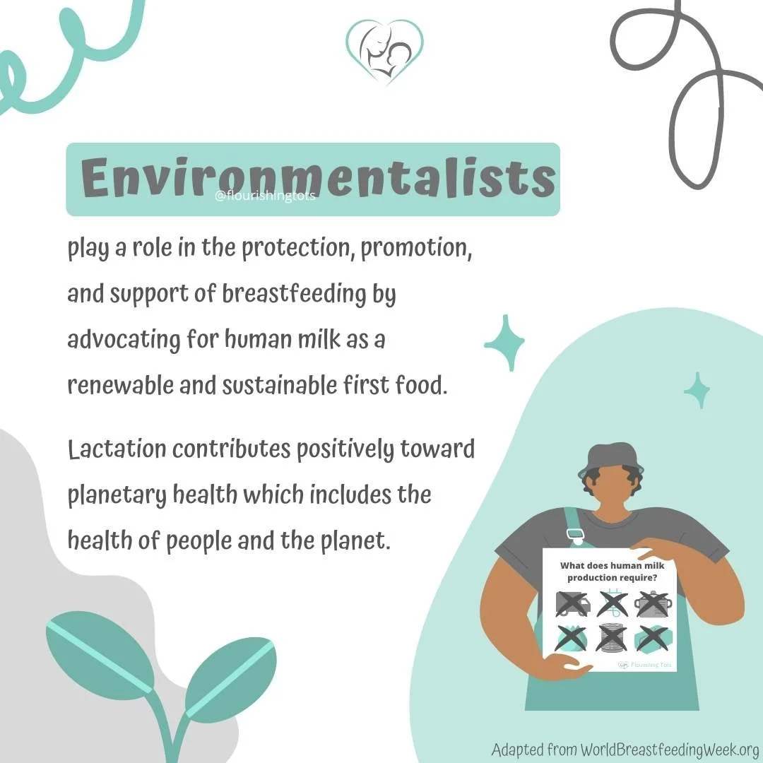 Environmentalists protect, promote, and support lactation by advocating for human milk feeding as a renewable and sustainable first food. Human lactation contributes positively towards planetary health which includes the health of people and the planet. —adapted from WABA